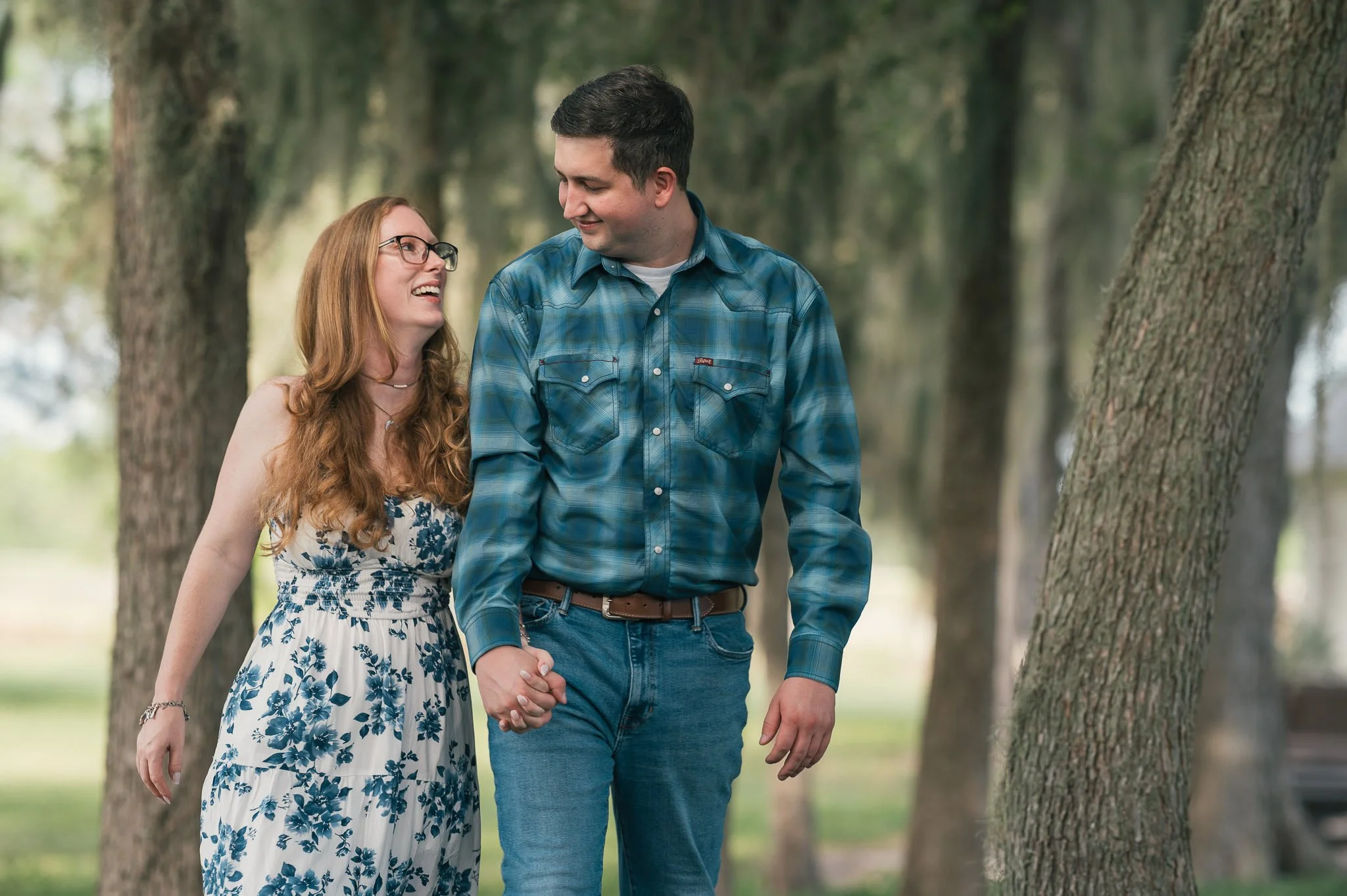 At one point, we asked them to do a little “bump walk”—it’s a goofy prompt we sometimes use where the couple walks toward us bumping hips and laughing. They nailed it. Not only did it break the ice, but it led to one of our favorite images of the session: the two of them hand-in-hand, mid-laugh, with the Spanish moss trees glowing behind them. Pure magic.