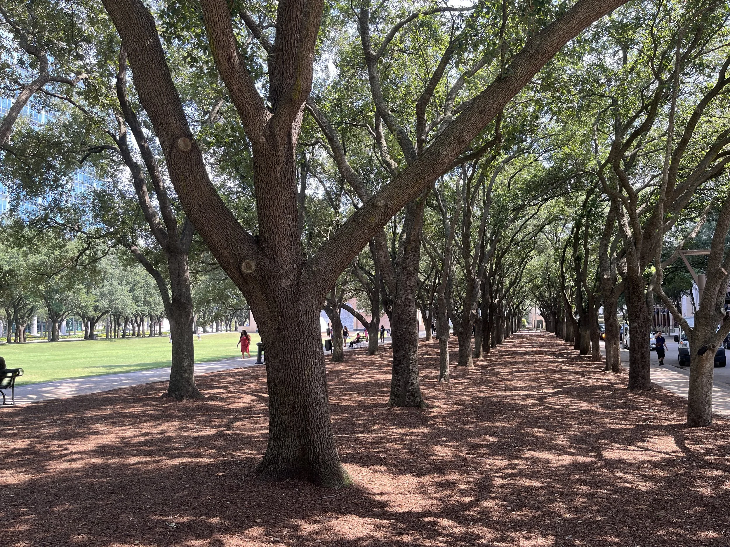Nearly 3 acres of green space with rows of live oaks make for a serene contrast to the urban hustle.