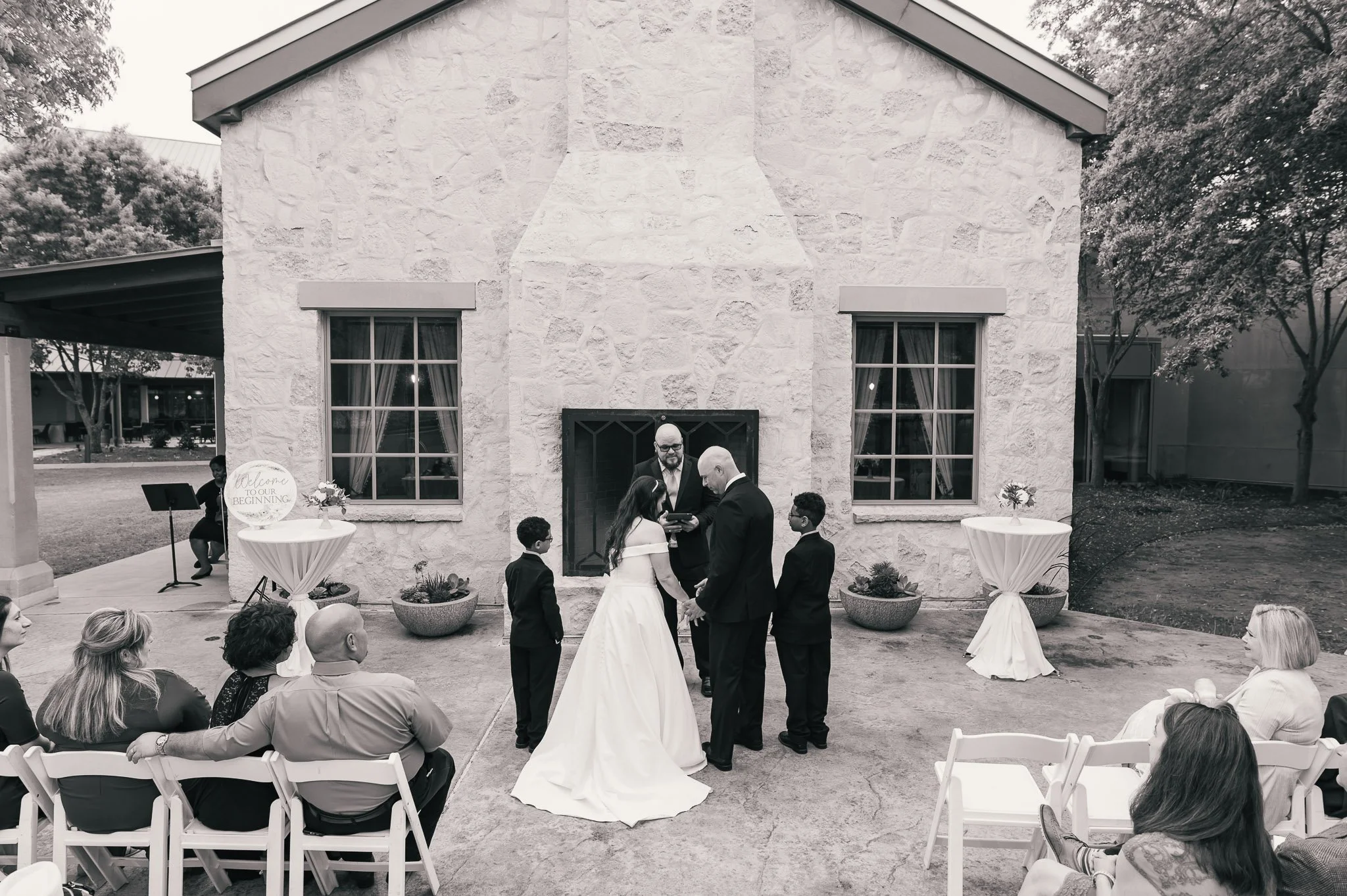 Ashley and Brandon chose The Sunday House, an outdoor ceremony site with views of the Hill Country. It felt intimate, and fit their vision perfectly. Their children stood with them during the vows, making it not just the joining of two people, but of an entire family.
