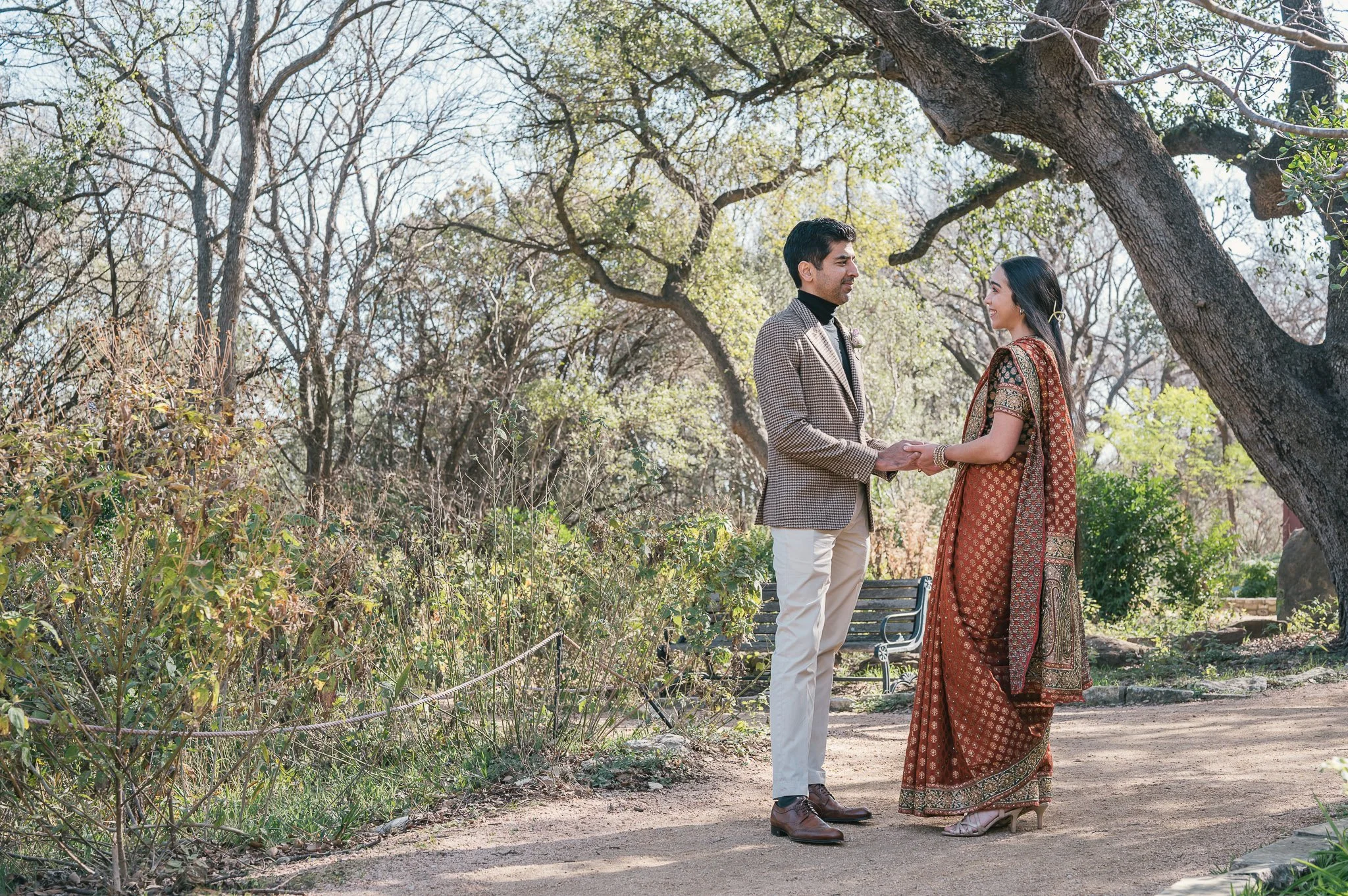Some weddings start with champagne flutes clinking and music drifting through a venue. Furqan and Kiara’s wedding started with something quieter and, in its own way, far more grounding. Morning light filtered through the trees at Zilker Botanical Garden, the air still cool, the paths mostly empty except for a handful of people who mattered most. Eleven, to be exact. Just Furqan and Kiara, their parents, and their siblings. Immediate family only. No extras. No distractions.