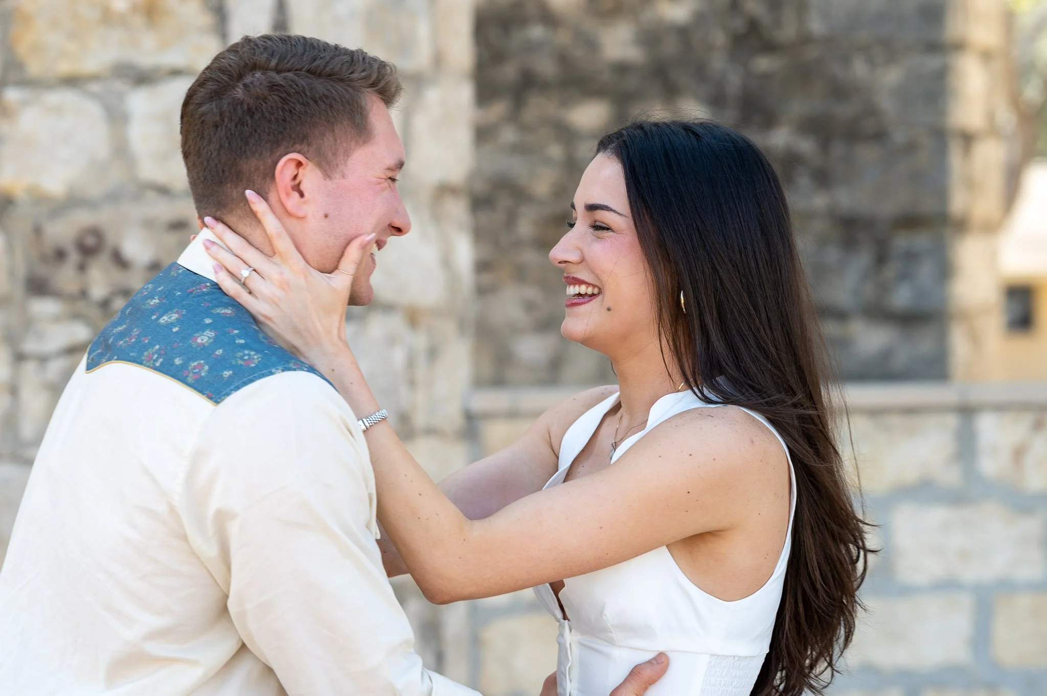 Briggs’ hands shook slightly as he slid the ring onto Jordyn’s finger. She laughed and cried at the same time, a sound that seemed to echo against the stone walls and into the quiet streets of Castroville. There was no rush, no audience, just two people standing outside a historic sanctuary, stepping into a future together. We captured it all, the details that would tell the story long after the moment passed: the ring catching the sun, their hands clasped together, their eyes locked in a gaze that said everything words could not.