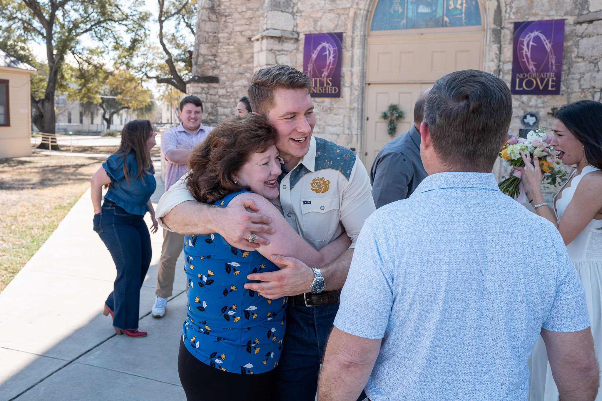 One of the sweetest parts of the afternoon came just after Jordyn said yes. As the laughter settled and they were still standing there outside the church doors, soaking in the moment, two familiar faces began walking toward them across the grounds. Briggs had quietly invited a couple of their close friends to be nearby, waiting patiently so they could celebrate with them the moment the question had been asked. The surprise on Jordyn’s face all over again was priceless. First the ring, then the realization that some of their favorite people had been part of the moment all along.